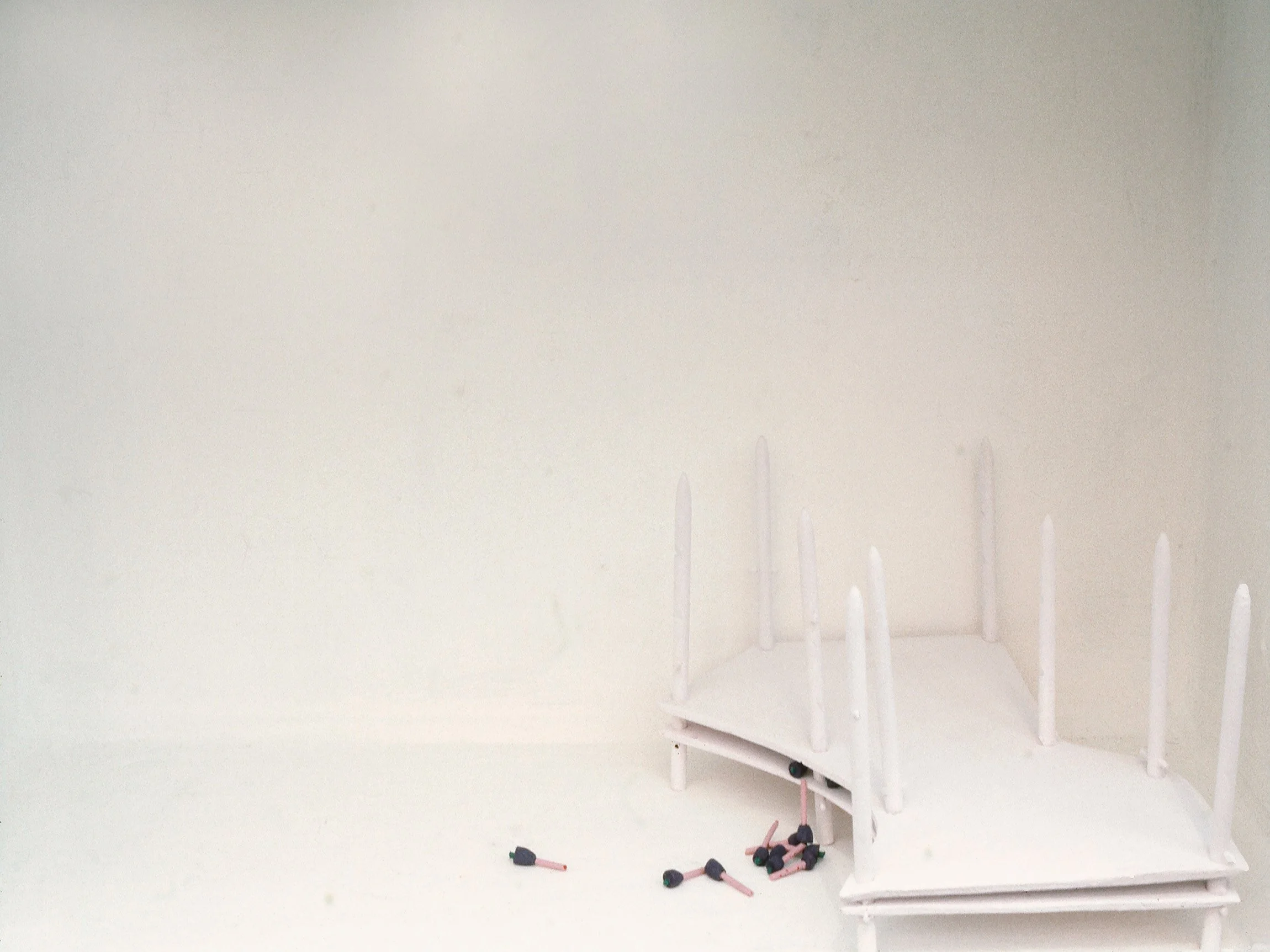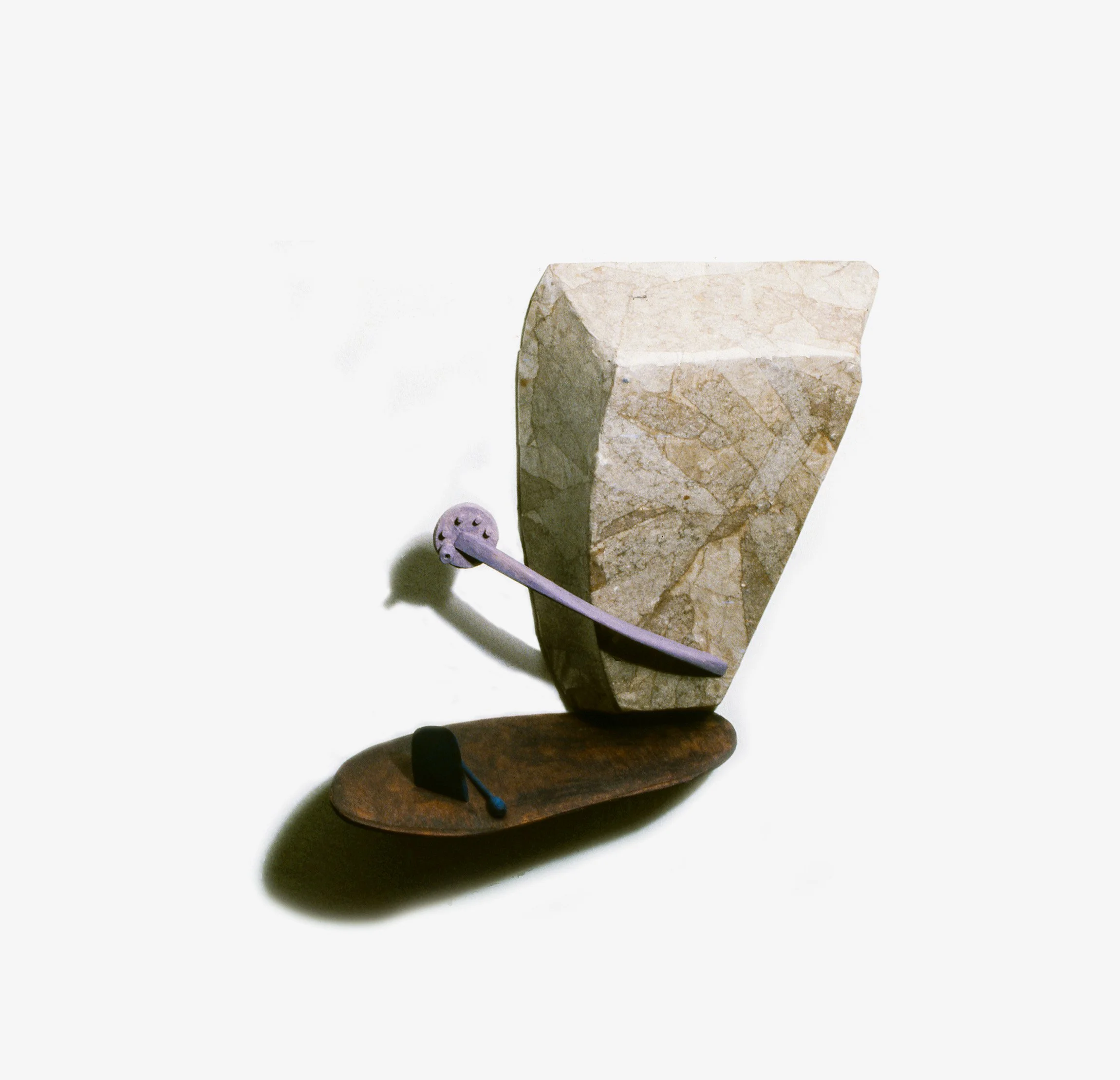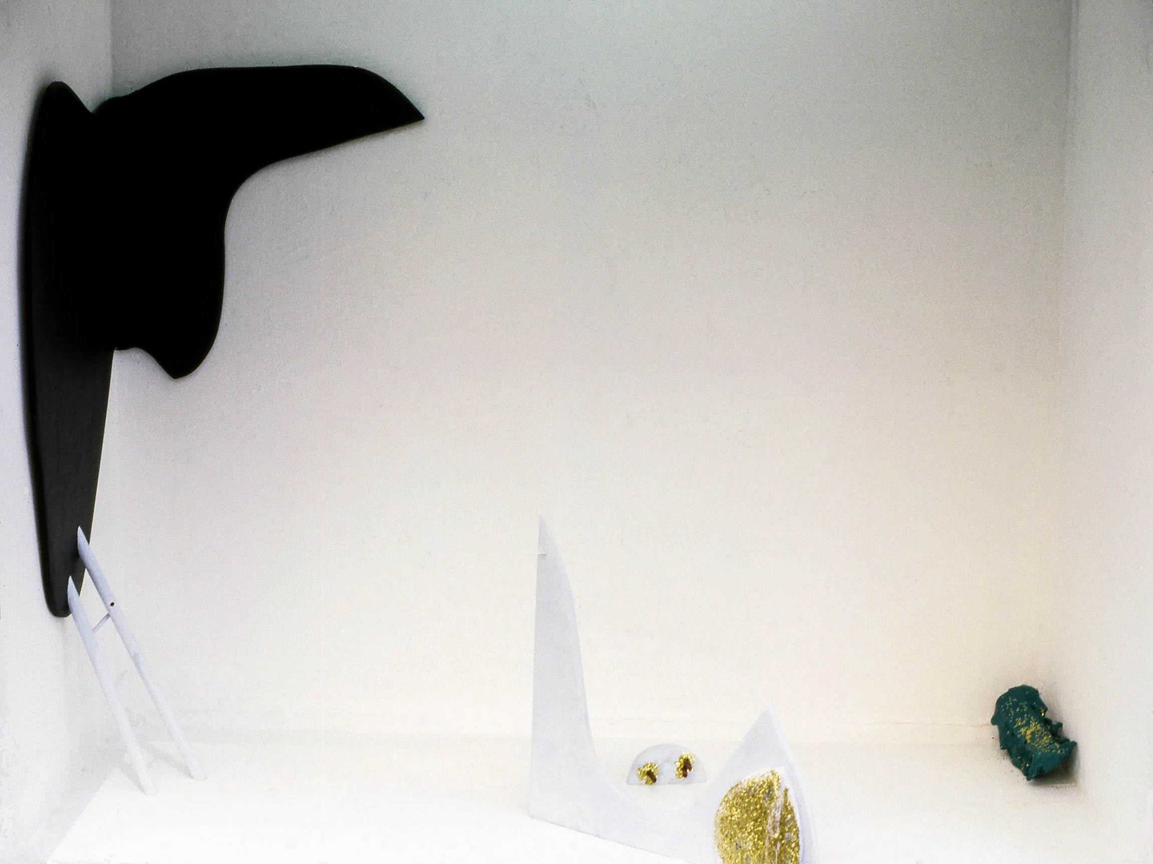 Intrigued by Joel Shapiro’s discovery in the early 1970’s of spatial engagement with objects of reduced scale, I created a series of small, intricately constructed sculptures that activated positions on the wall plane away from the reach and slightly out of the normal viewing range as a means of controlling a specific area.