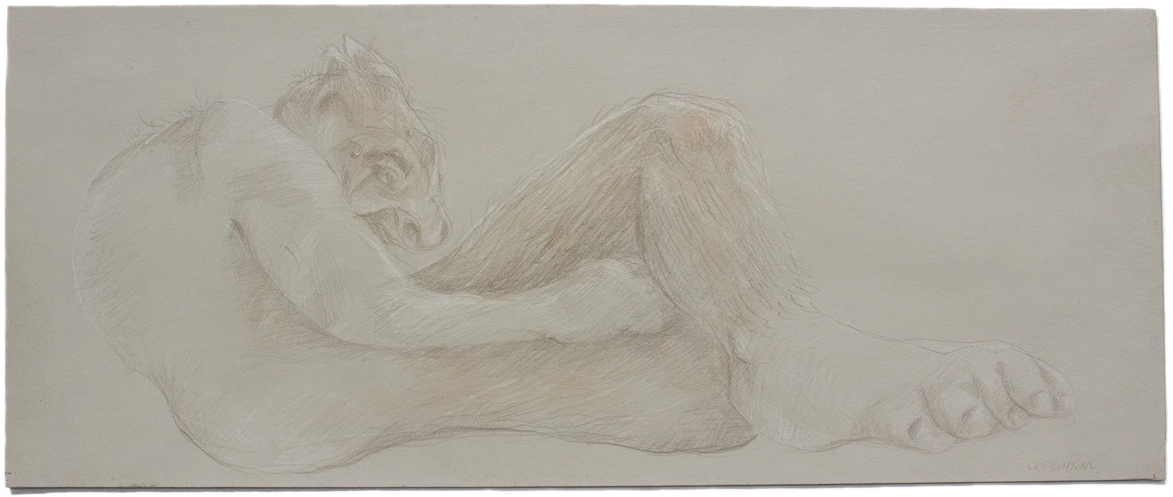 Caliban, 1971. Charcoal silverpoint on treated paper, 4 x 9”.