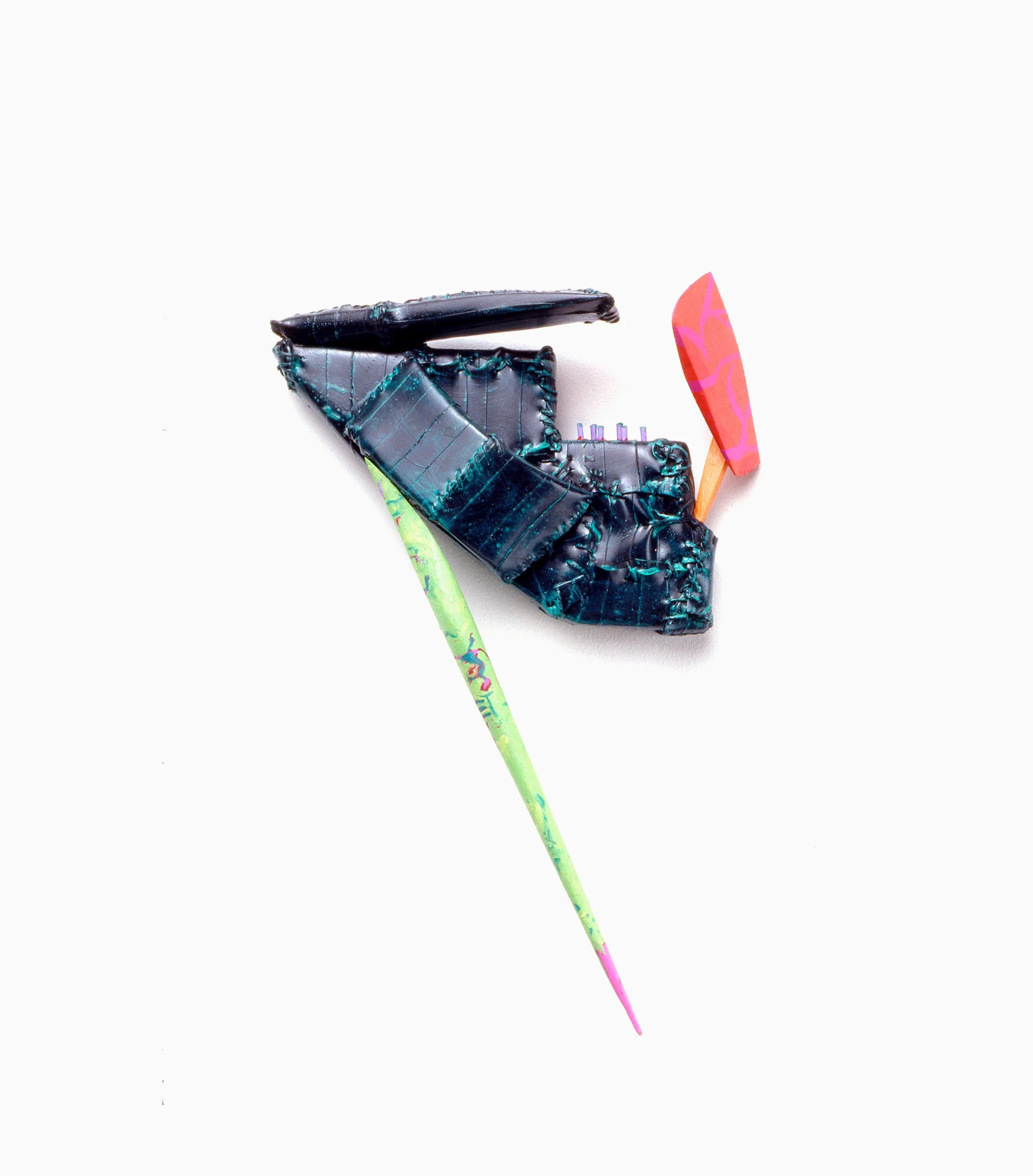 Minimal forms replaced fanciful ones, constructed from a combination of found and randomly cut plywood shapes, covered with materials such as bicycle inner tubes, umbrella nylon and scrap sheet metal.
