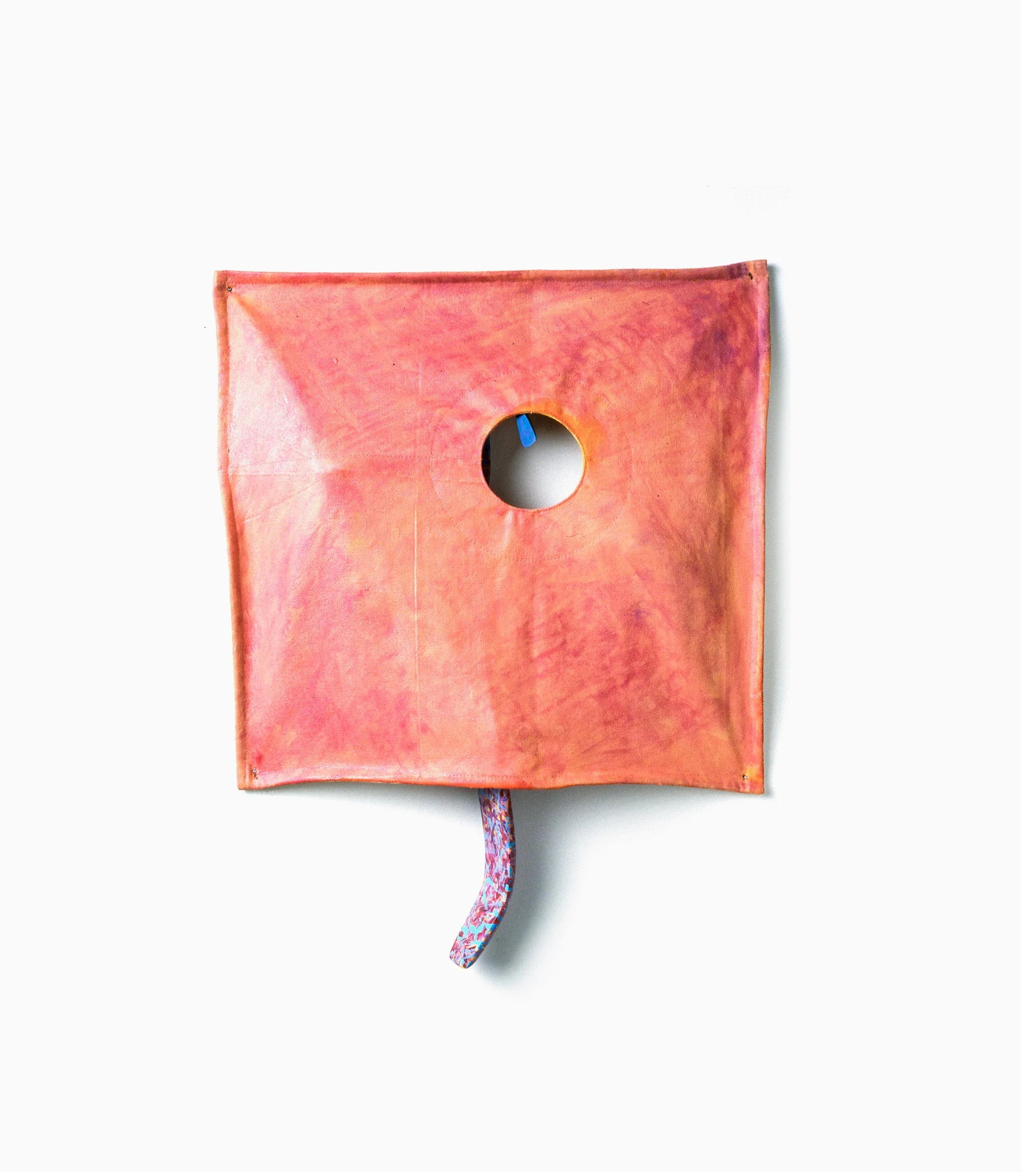 Monkey Tails, a series of three-dimensional, inverted paintings, referenced the fanciful forms that dominated my earlier, Surrealist inspired paintings. These colorful wooden objects residing behind stitched canvas, agitate the surface, protrude from different sides or peek through the central openings teasing the viewer as to their identity.