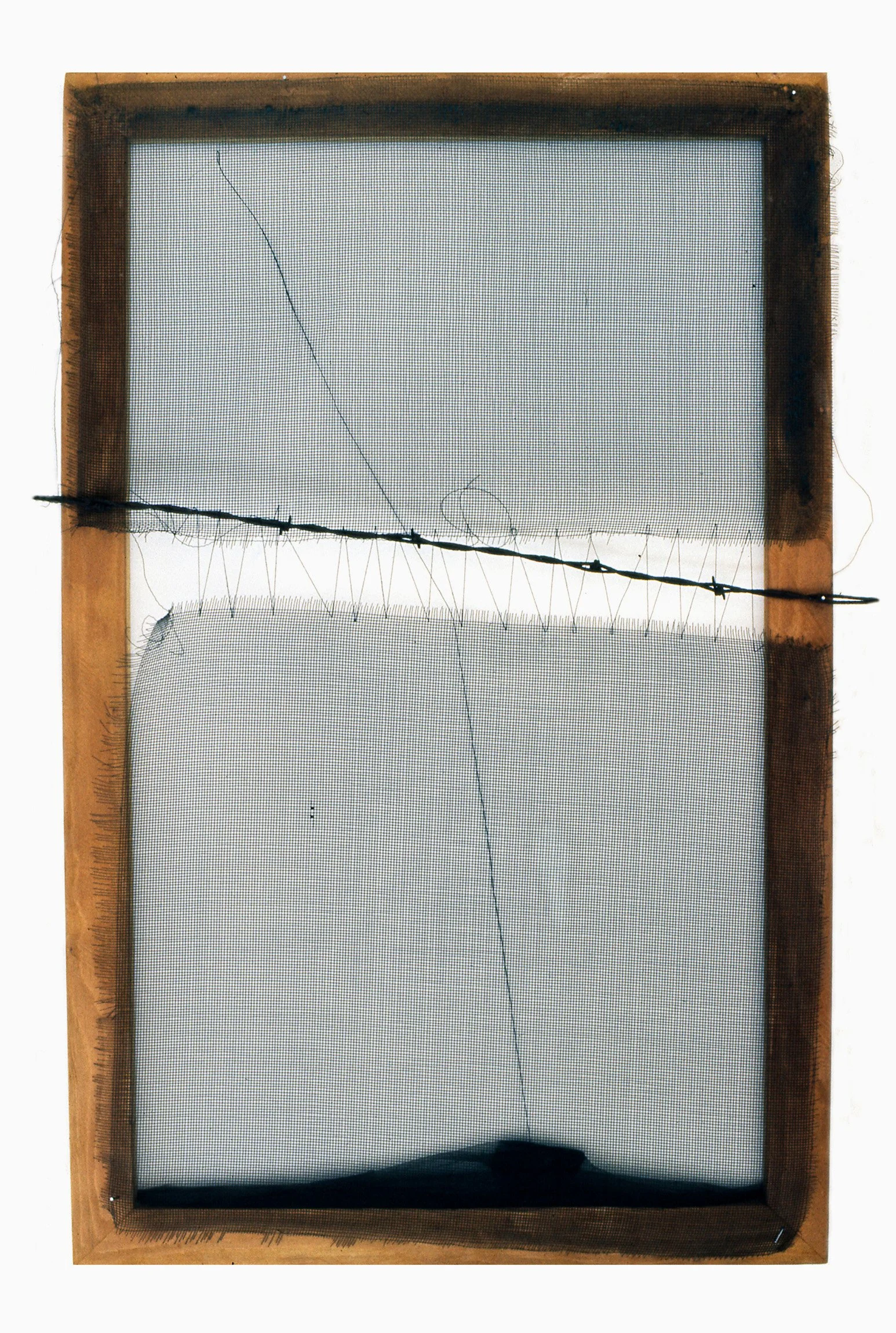 Orgma 377, 1977. Screen, wire, barbed wire, hose, thread, and discarded stretcher, 24 x 20”. (Lost.)