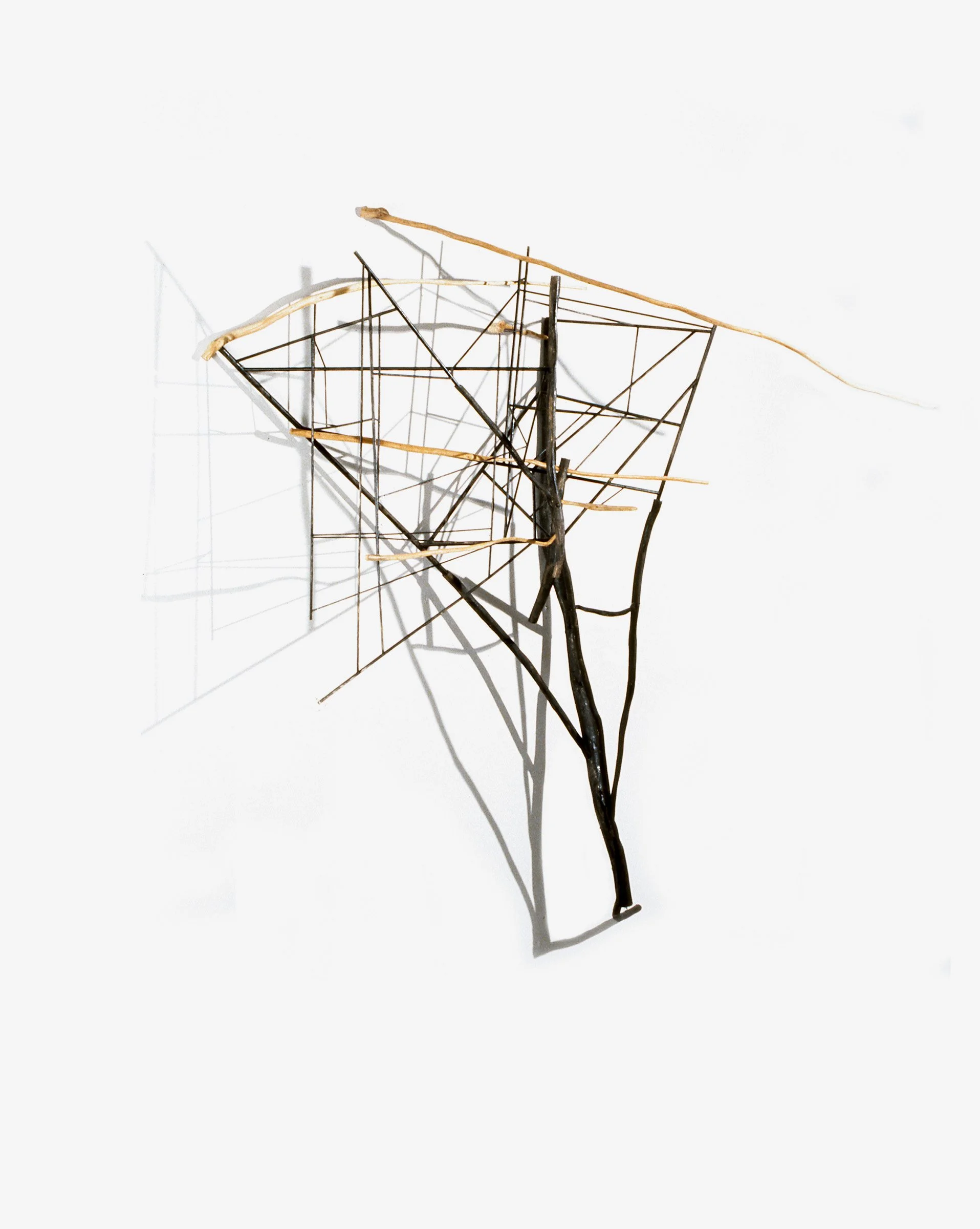 In the Consort series, conifer branches are joined with cut plywood shapes to create forms whose existence seem momentary. Pairing a gesture with agitated marking activity helps to achieve this tenuous balance.