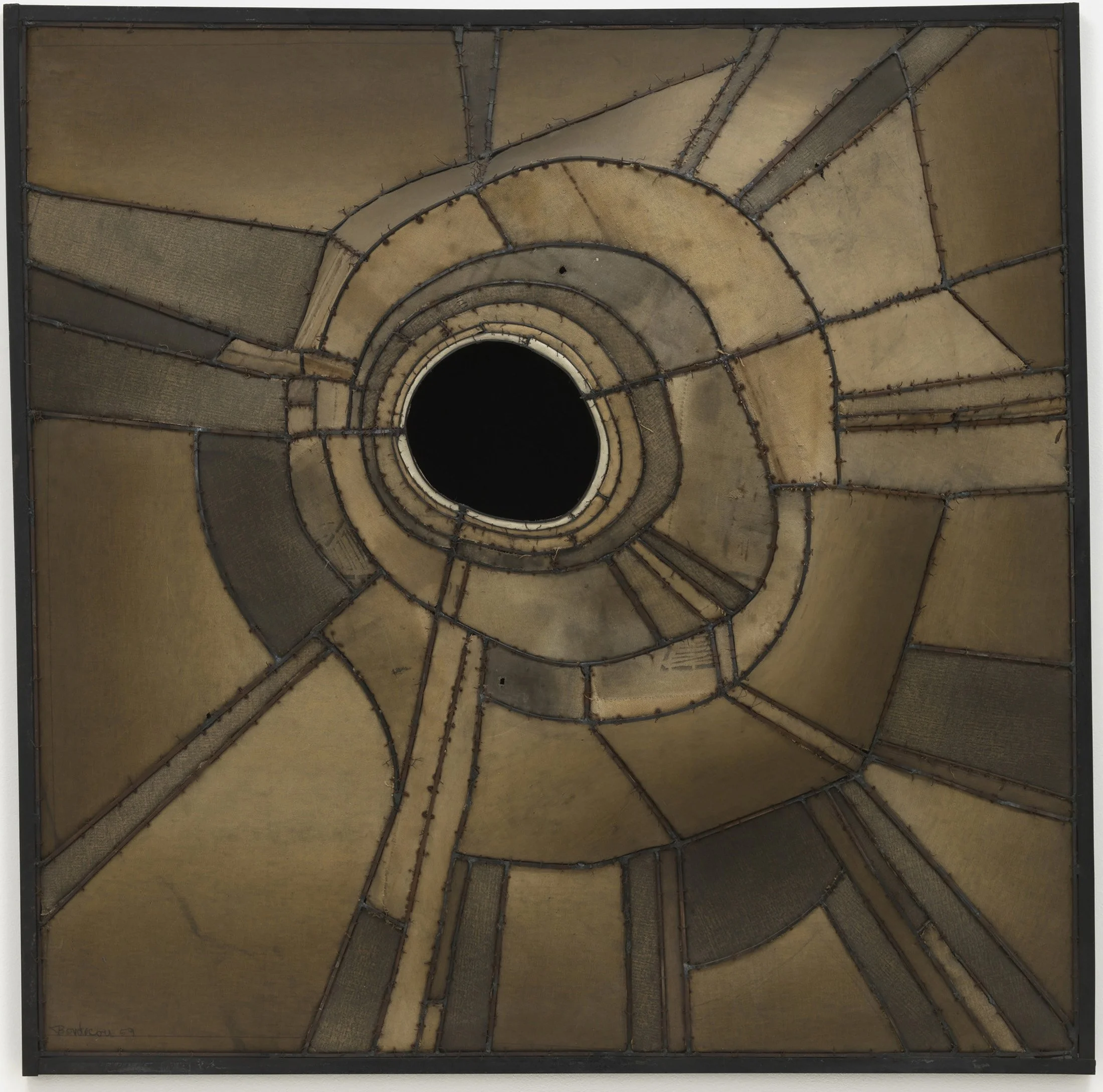 Lee Bontecou, Untitled, 1959. Welded steel, canvas, black fabric, soot and wire, 58 1/8 x 58 1/2x 17 3/8”. Collection: MoMA.