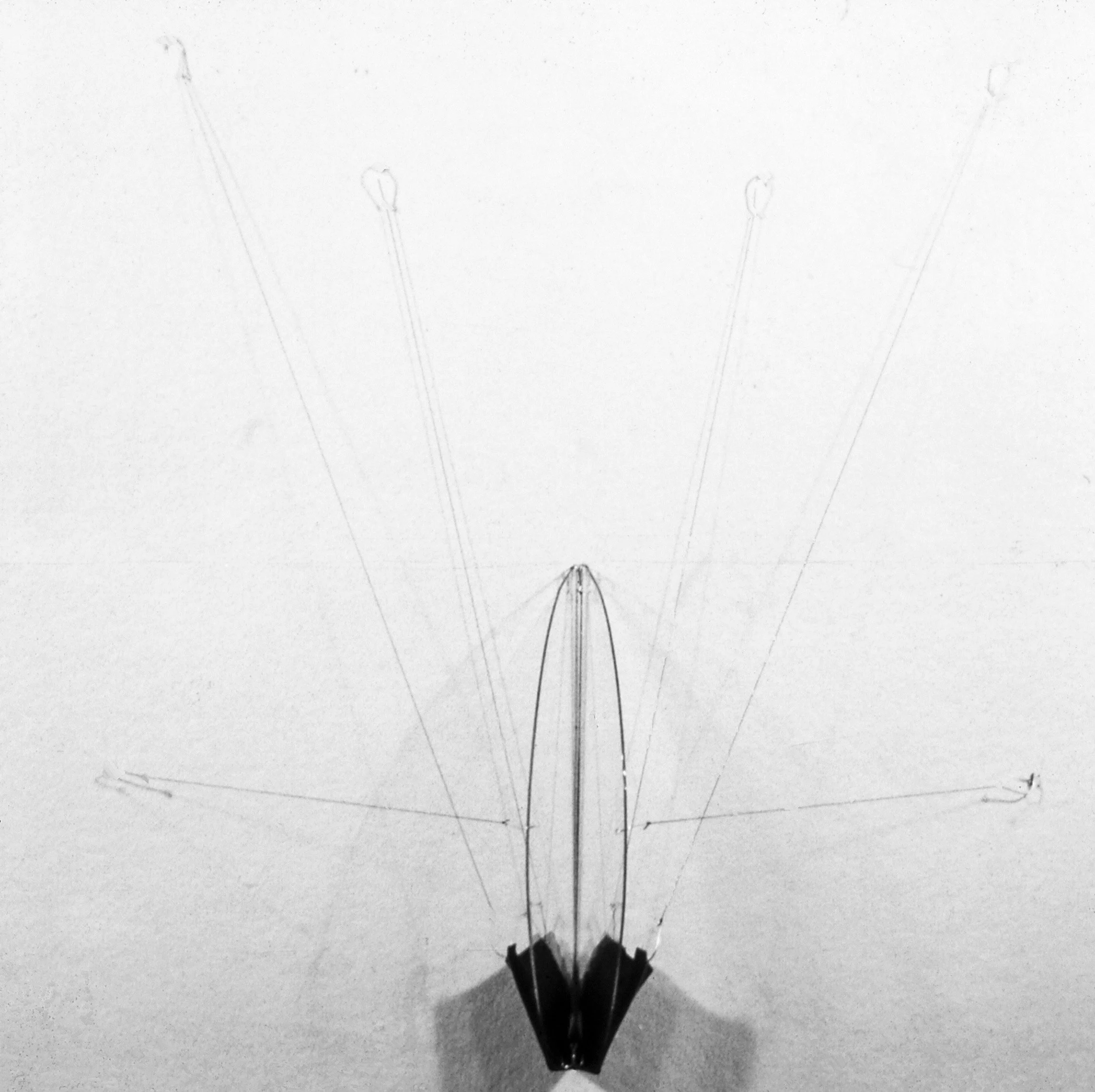 Pliver 277, 1977. Pliver skin, glass, hooks 40 x 25 x .75”. (Lost.)