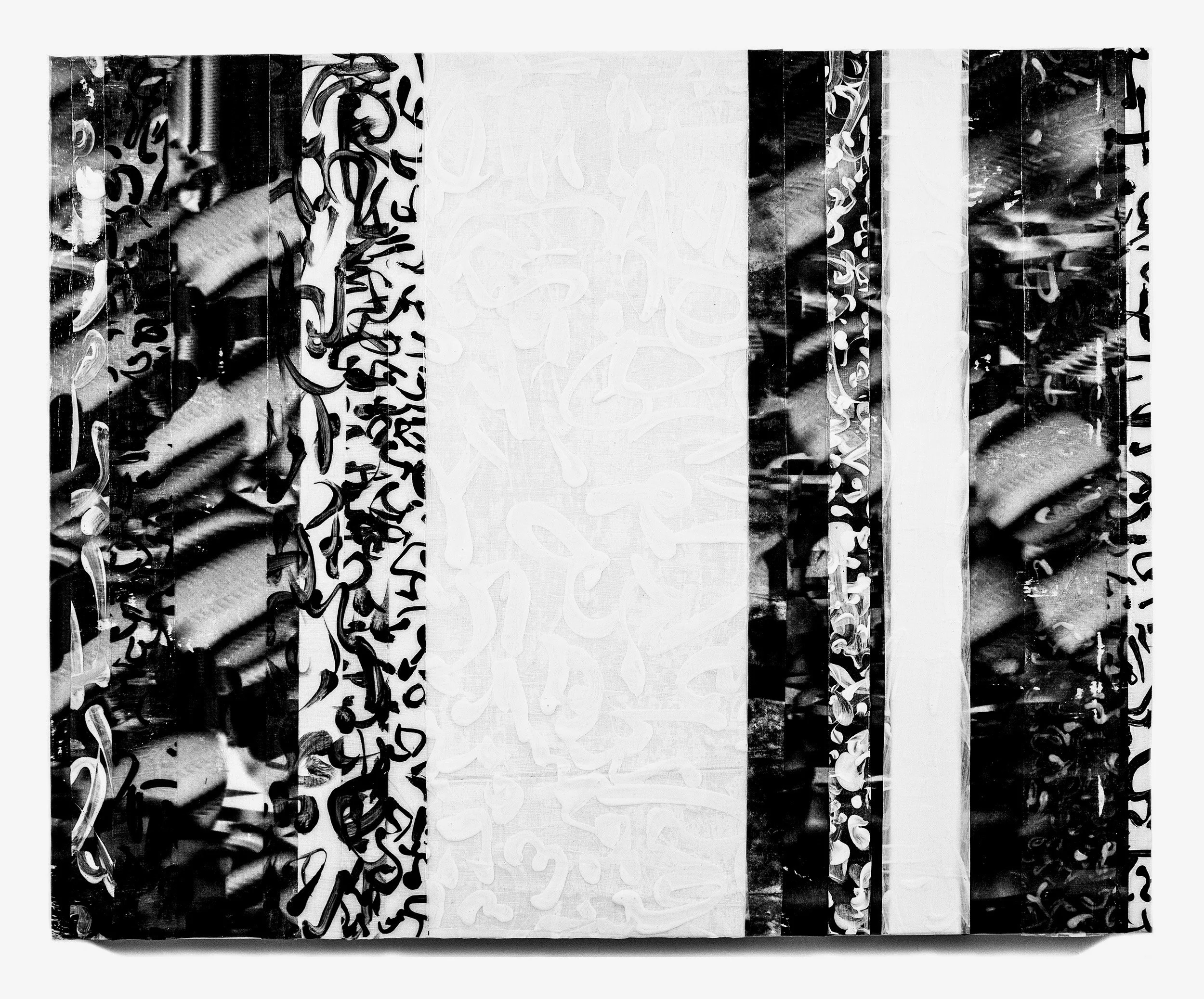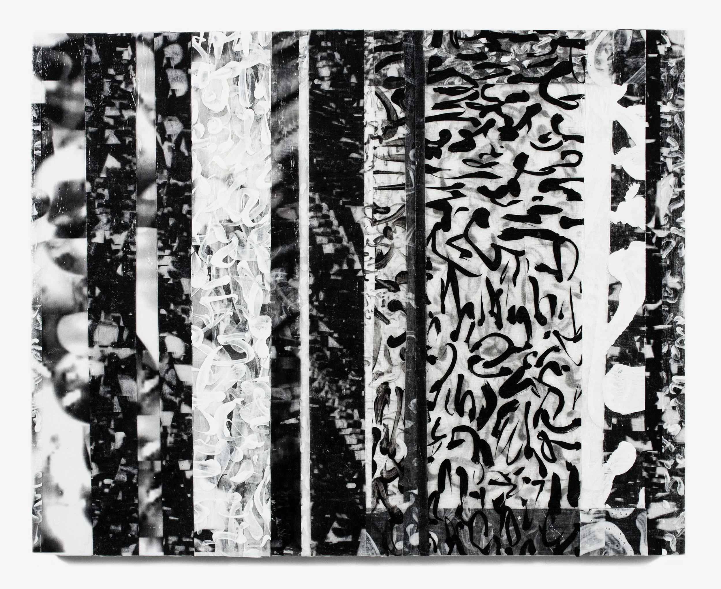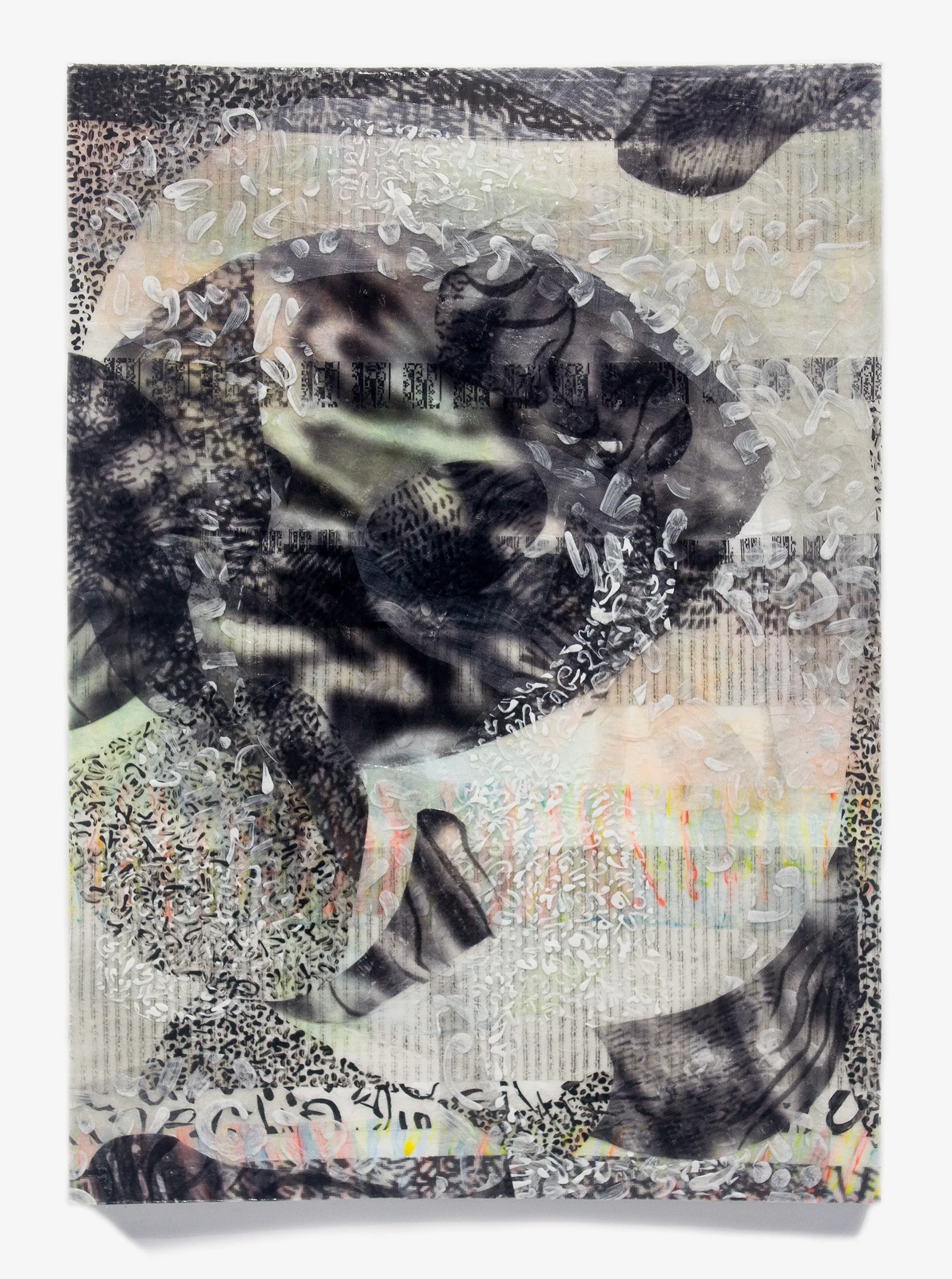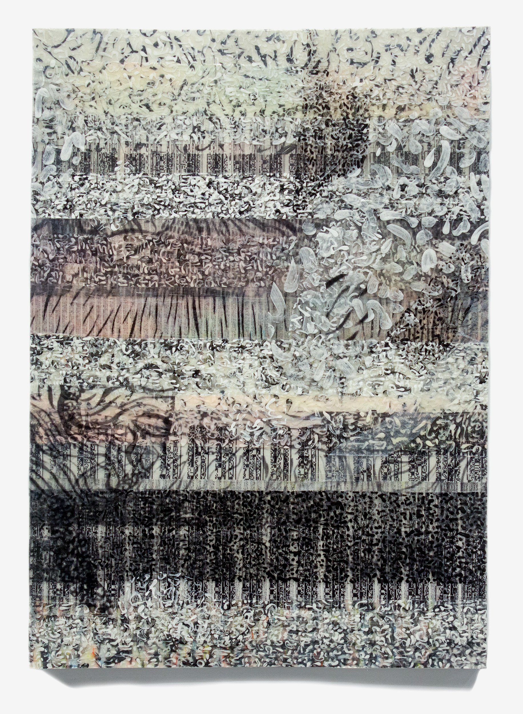 Babble 323, 2021–23. Applied acrylic and digital transfer on panel, 30 x 24 x 2”.