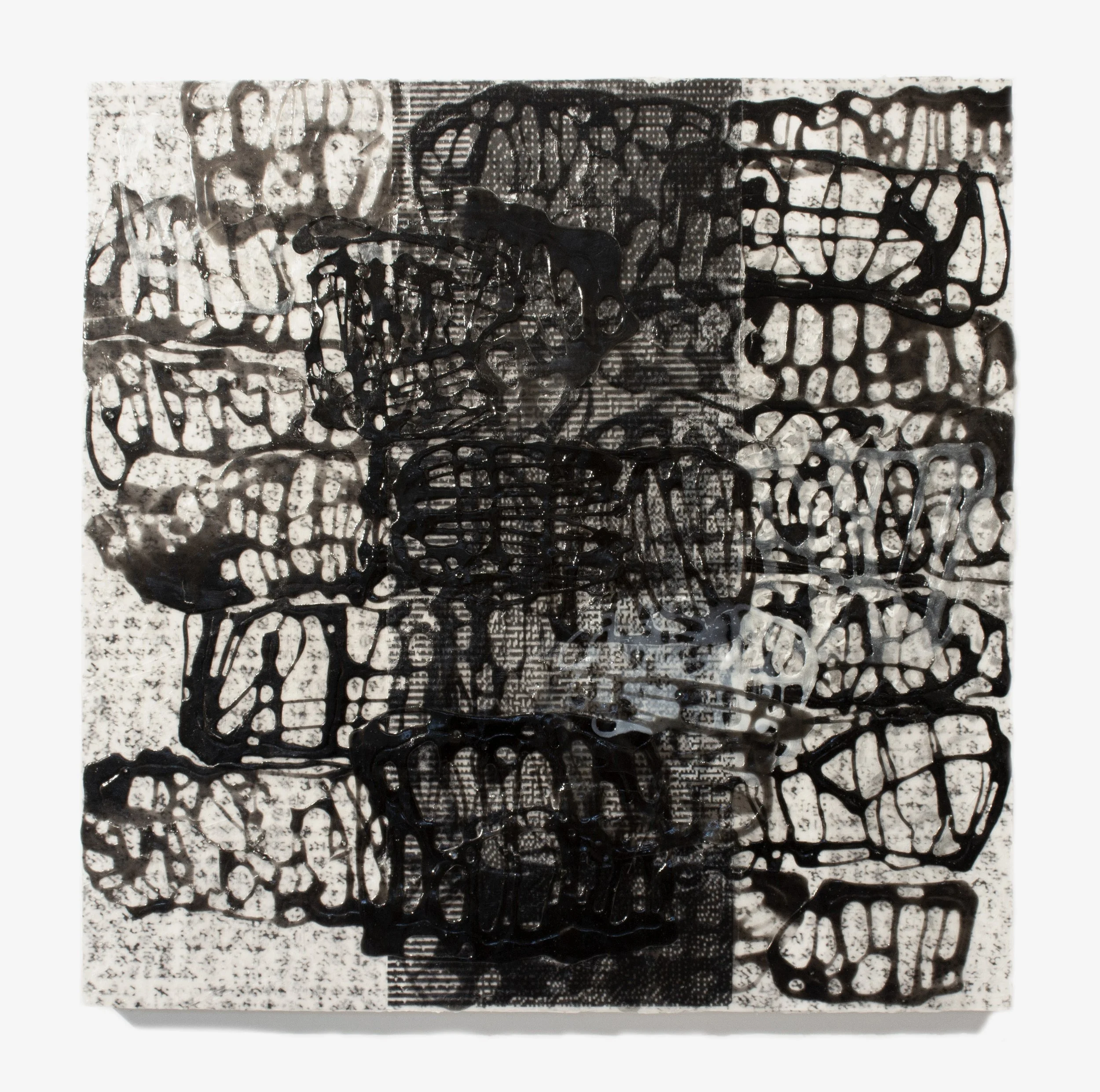 Babble 223, 2021–23. Applied acrylic and digital transfer on panel, 24 x 24 x 1.75”.