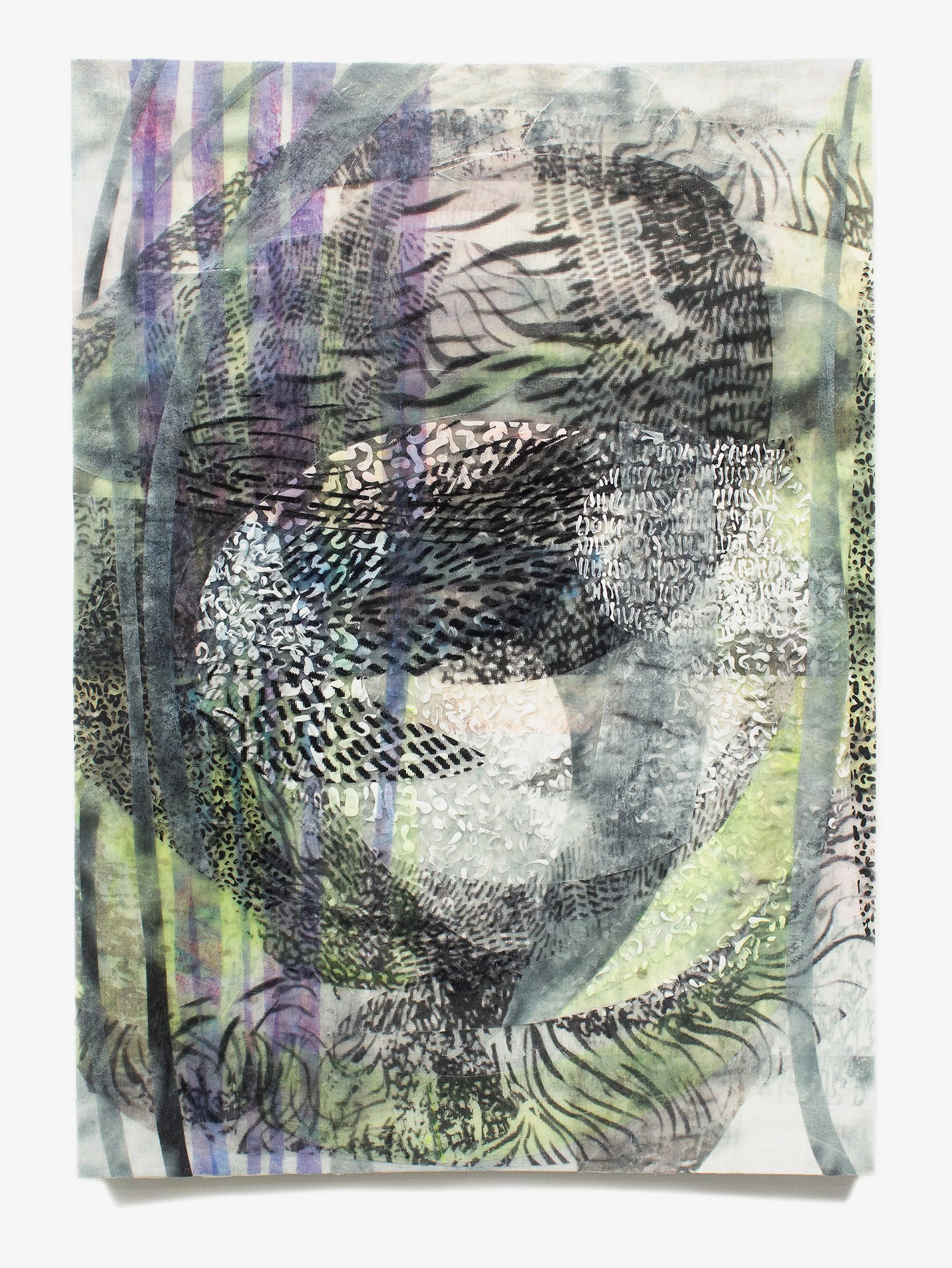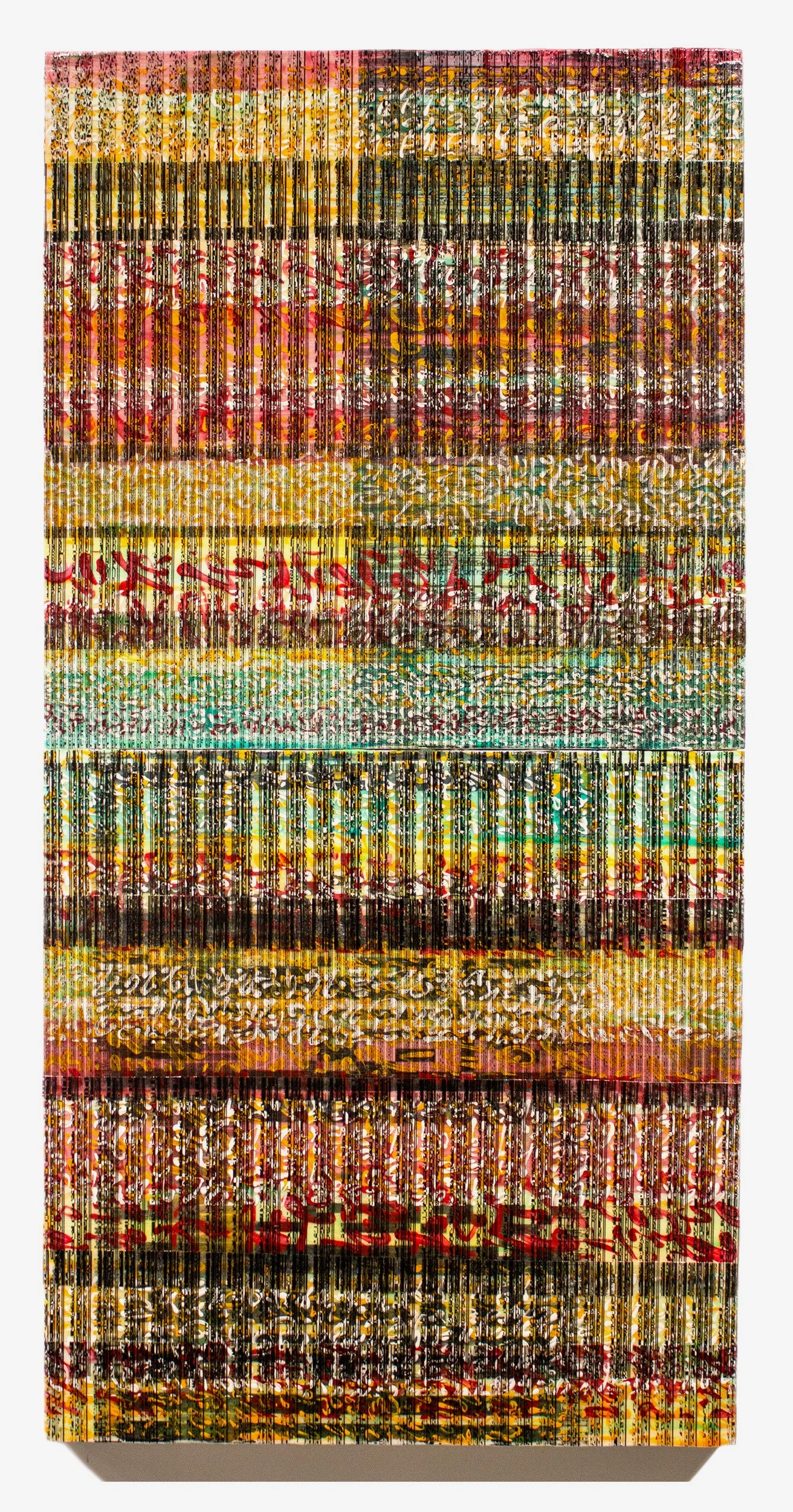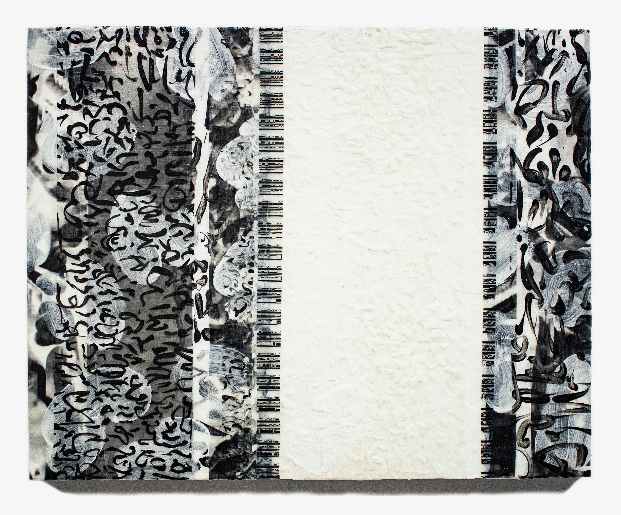 Twiddle 924, 2024. Digital transfer and applied, layered acrylic on panel, 36 x 24 x 2”.