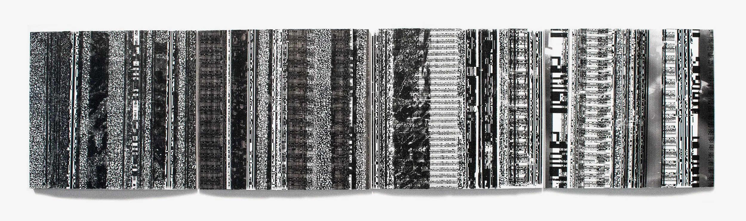 Transdimensional Motifs is a category of digital patterns used in my practice to add context, dimension, and history. Morphic patterns occur by digitally redrawing images of current and previous work from several disciplines with varying degrees of visual connection. Produced by accident, corrupted image patterns happened when I used an obsolete application to open a raw image file. Instead of an image, the application generated a barcode like pattern, which I interpreted as the computer’s “drawing” equivalent to an image. Known later by its abbreviation c.i.p., these algorithmic like patterns would not only expand my marking vocabulary but also give additional definition and associations to my work.