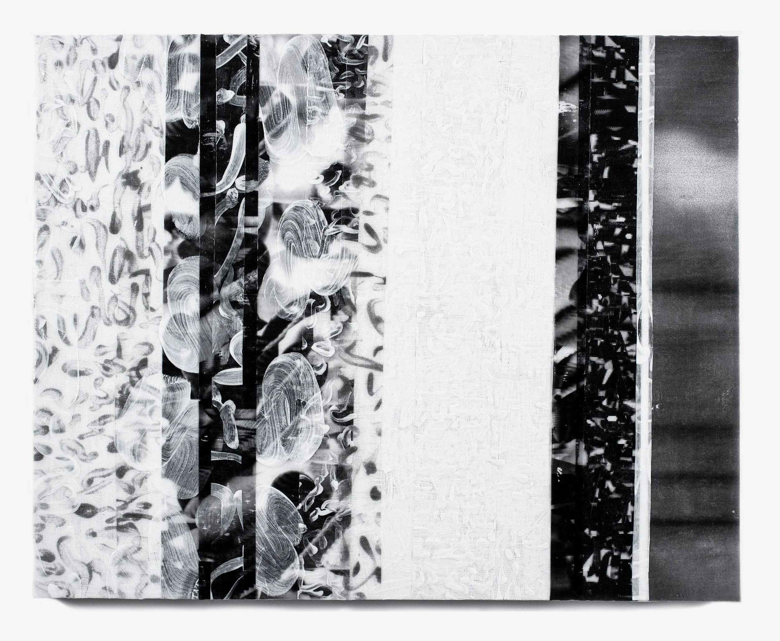 Backchannel 811, 2011. Layered glue and acrylic with digital transfer on panels, 48 x 24”.