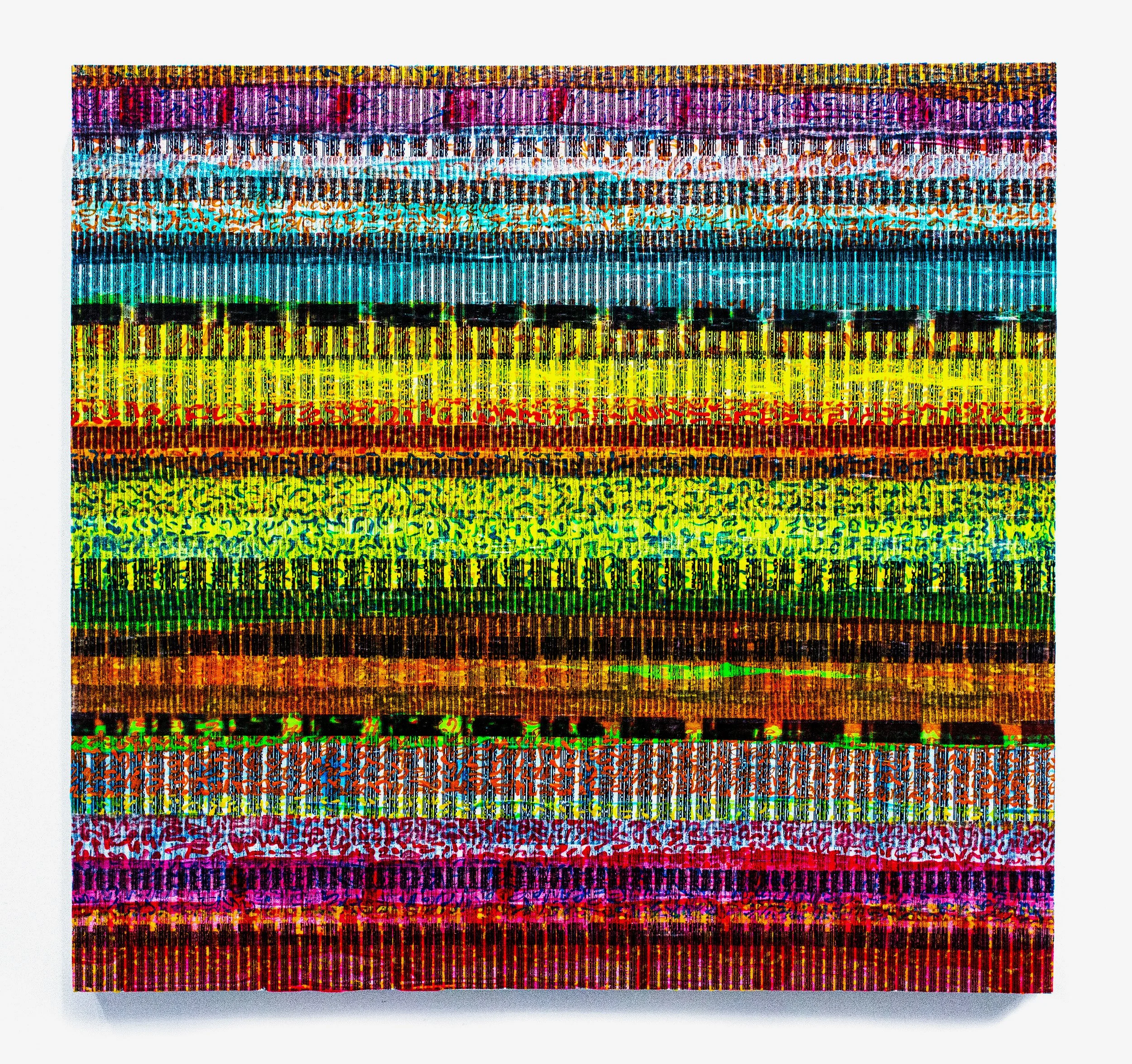 Twiddle 524, 2024. Digital transfer and applied, layered acrylic on panel, 36 x 24