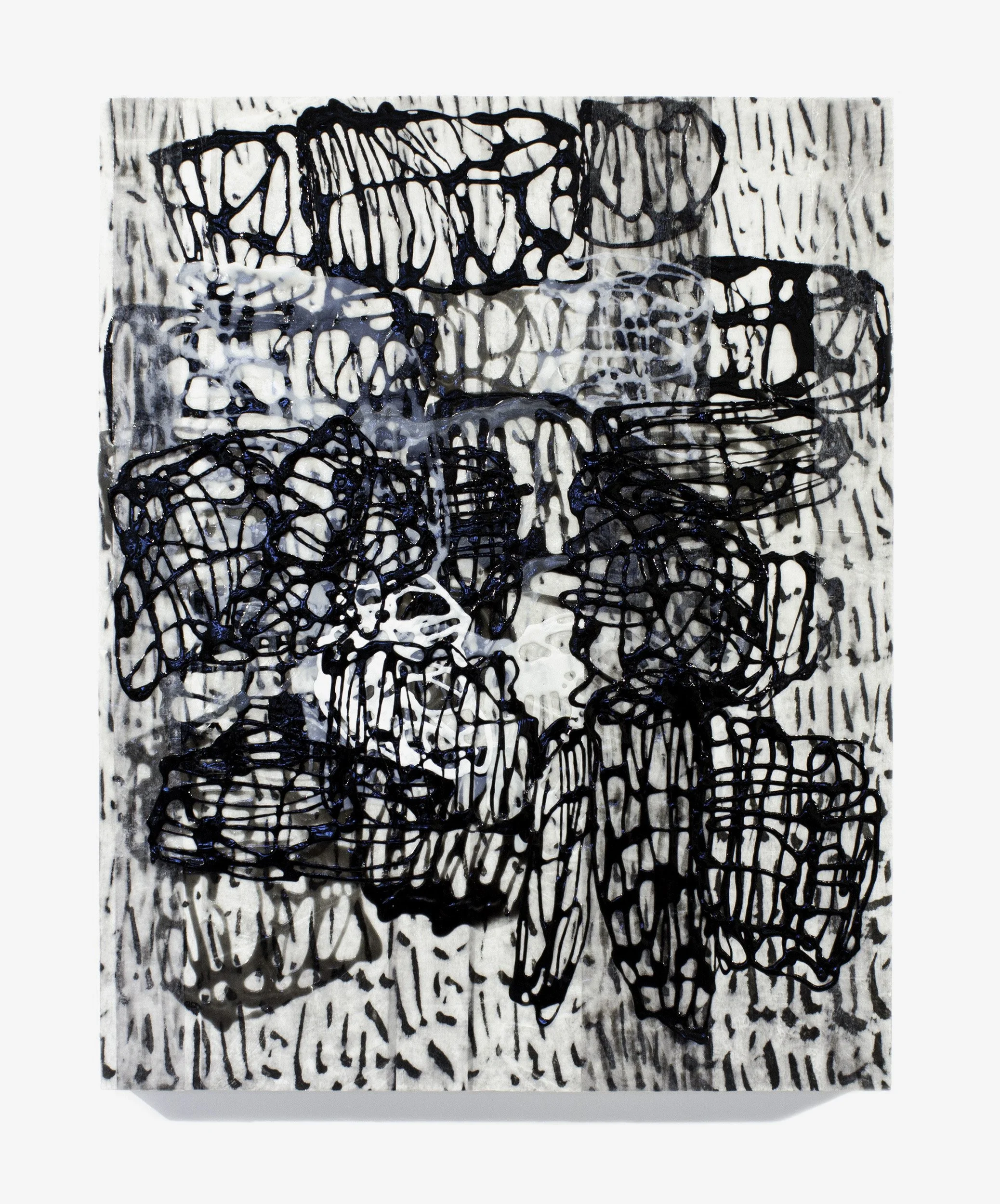 Layered with translucent veneers of synthetic calligraphy interspersed with c.i.p.’s and previously painted marks, Chronicle continues in developing a visual language as well as documenting the processes and techniques I have used in my practice over the last fifteen years. Shifting the focus of preceding series such as Palimpsest and Script, which referenced manuscripts, Chronicle returns to a much earlier conversation on the relationship between a stitch and a mark. It is with this profound connection discovered fifty years ago in the sculpture of Lee Bontecou that began my transition from painting to sculpture by way of drawing.