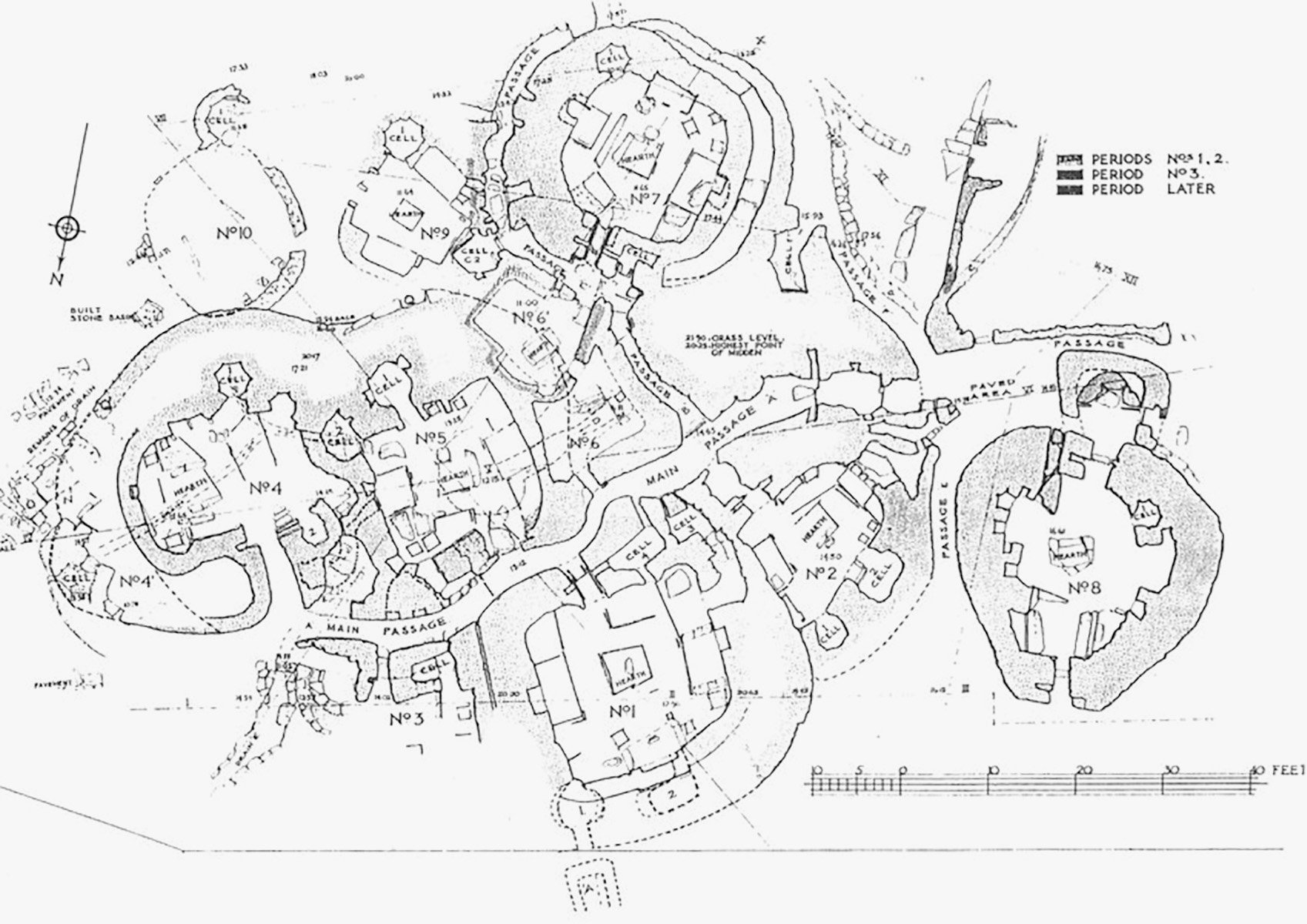 Ground Plan of Skara Brae, 3180–2500 BC (after Childe, 1931). Drawing by Merryn Dineley.